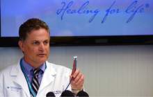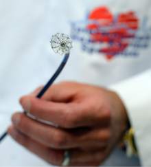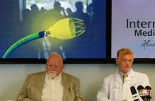 Intermountain Medical enter Heart Institute cardiologist Pete Weiss, MD, talks about the Watchman left atrial appendage closure device, back, a life-saving and heart-preserving cardiac device that has been tested extensively in clinical trials by scientists and cardiologists at the Intermountain Medical Center Heart Institute in Murray. The device will be available this month, for the first time, to all eligible Utah patients for widespread clinical care outside of the research arena. The device is the first and only one of its kind available in the United States. The Intermountain Medical Center Heart Institute has been one of the leading national research sites, and is the first and only Utah hospital authorized to implant the device at this point. The device was introduced at a press conference at the Intermountain Medical Center Doty Education Center in Murray, Utah Monday May 16, 2016.