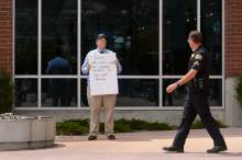 When police emerged, they greeted protesters holding signs and shouting to passers-by, urging them to sign petitions. Police then left. Center officials later took pictures of the protesters, but they did not seek to stop their activities.