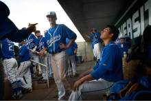 Pleasant Grove relief pitcher Payton Henry, right, sits in the dugout prior to coming out to get the last three outs. Pleasant Grove defeated Bingham 6-2 to win the Utah 5A title, Thursday, May 21, 2015.