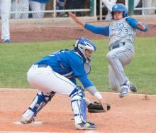 Pleasant Grove catcher Payton Henry loses his grip on the ball as Cottonwood's Hunter Blunt scores to tie the game at 1-1 in the second inning. Pleasant Grove defeated Cottonwood 3-2 to win the winner's bracket final at UVU, Thursday, May 21, 2015.