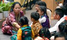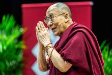 Then the Nobel laureate, who calls himself a "simple monk," took his seat, signaling the crowd to do likewise. He accepted gifts from the community and listened with obvious delight as Tibetan children entertained him with a song from their homeland.