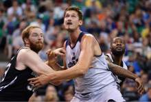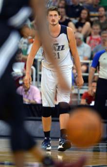 Utah Jazz center Tibor Pleiss guards the paint during the Jazz versus Spurs summer league g