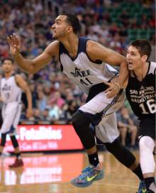 Utah Jazz forward Trey Lyles breaks free of a hold from Spurs guard Ryan Arcidiacono during