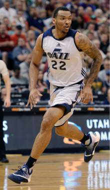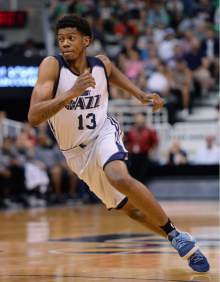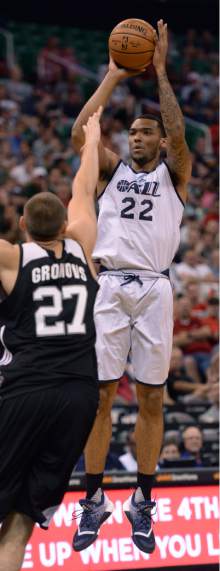 Utah Jazz forward Trey Lyles fires a shot during the Jazz versus Spurs summer league game at the Vivint Smart Home Arena in Salt Lake City Monday July 4, 2016.