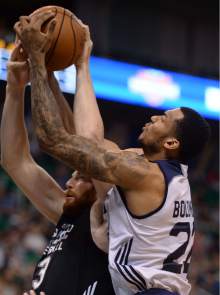 Utah Jazz forward Trey Lyles breaks free of a hold from Spurs guard Ryan Arcidiacono during the Jazz versus Spurs summer league game at the Vivint Smart Home Arena in Salt Lake City Monday July 4, 2016.