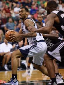 Utah Jazz forward Trey Lyles and center Tibor Pleiss block the path of Spurs guard Kyle Anderson during the Jazz versus Spurs summer league game at the Vivint Smart Home Arena in Salt Lake City Monday July 4, 2016.