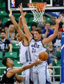 Utah Jazz center Tibor Pleiss, center battles Spurs center Alex Kirk for position during the Jazz versus Spurs summer league game at the Vivint Smart Home Arena in Salt Lake City Monday July 4, 2016.