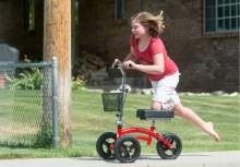 Lydia Petrucka, 10, rides her knee scooter near her home in Springville. She will be attending the Amputee Coalition Paddy Rossbach Youth Camp in Clarksville, Ohio next week.