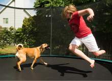 Lydia Petrucka, 10, jumps on the trampoline with her dog Linder, at her home in Springville.