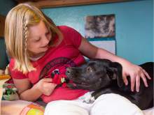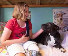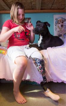 Lydia Petrucka, 10, plays with her 3-legged dog Clover. Lydia will be attending the Amputee C