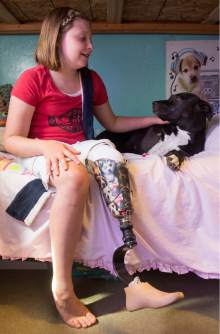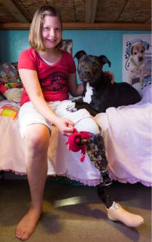 Lydia Petrucka, 10, plays with her dog 3-legged dog, Clover in her room. She will be attending the Amputee Coalition Paddy Rossbach Youth Camp in Clarksville, Ohio next week. Despite the loss of her left leg, she spending time with her dogs and jumping on her trampoline. Saturday, July 2, 2016.