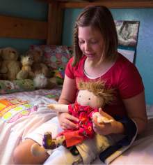 Lydia Petrucka, 10, plays with her doll, Lillia, who also has a prosthetic leg. Lydia will b