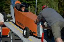 Evan Williams, 10, gets his "Farmer Tan" racer put into position as kids comp