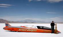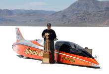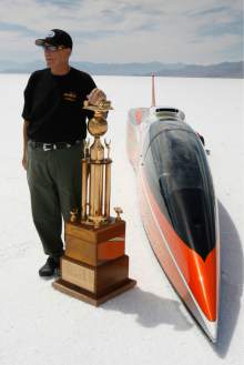 George Poteet stands by his car "Speed Demon," along with the Hot Rod Magazine trophy, at the Bonneville Salt Flats, Thursday, August 18, 2011. The Speed Demon's top speed was 427 mph.