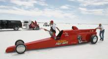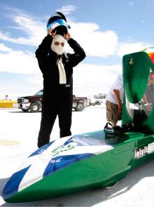 Rick Pearson prepares for a run on the Salt Flats in his car "Flower if Scotland" during Speed Week, at the Bonneville Salt Flats, Thursday, August 18, 2011.