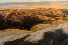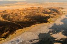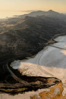 An aerial view of Antelope Island, showing the scope of the damage caused by a fire that burned up much of the island.
