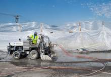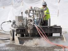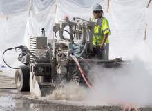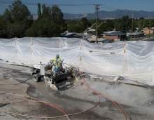 Todd Brown uses a hydro demolition machine on a bridge deck on I-215. The new technique uses