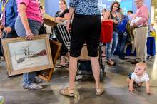 Levi Mitchell crawls along the floor next to his mother Sarah Mitchell at the Salt Palace Convention Center in Salt Lake City, where The Antiques Roadshow taped three episodes Saturday August 13, 2016.