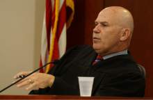 Judge Richard McKelvie talks with defense attorney Scott Wilson during preliminary hearing