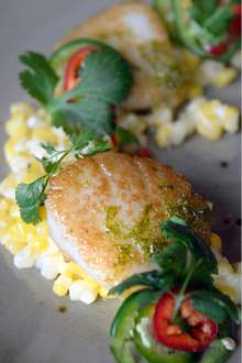Ryker's Seared Scallops with honey-lime dressing and Utah corn ragu