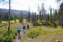 Cindy Bird Vance, Amanda Wagner and Peter Wagner hike along Henrys Fork Trail toward King
