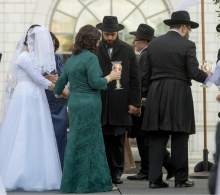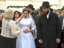 Chaya Zippel and Rabbi Mendy Cohen are greeted by loved ones after their traditional Hasidic