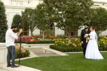 Rabbi Mendy Cohen and Chaya Zippel pose for photos after their traditional Hasidic wedding ceremony at the Grand America on Monday, Sept. 12, 2016.