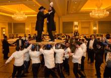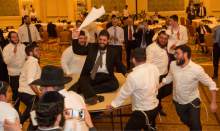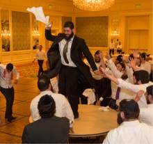 Rabbi Mendy Cohen dances on a table during a traditional Hasidic wedding celebration at the G