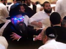 Rabbi Benny Zippel wears funky glasses as he joins the dancing during the traditional Hasidic