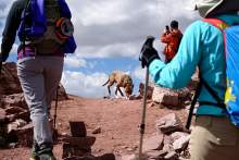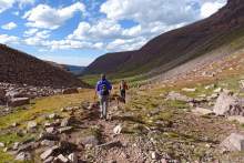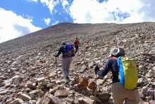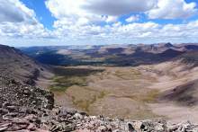 Hike • Make sure you have proper hiking boots, because this one's a slog. From Henrys Fork, the trail leads south toward Kings Peak through forests of aspen and pine. Incline is gradual. About 5.5 miles along the trail, you will encounter a fork. To the right is Henry's Fork Lake and a route that adds a few extra miles to the trip. Take the left fork toward Dollar Lake and carefully navigate the bridge at Elkhorn Crossing. Continue along the trail for another mile and, after passing through some trees and a brief steep, rocky area, you'll reach a clearing and Kings Peak will come into view. From a distance, it doesn't appear to be the highest peak but you can recognize it by its pointy shape and a series of steps leading to the peak (false summits that might fool you later). About 8 miles in, watch for signs prohibiting campfires near lakes and Dollar Lake is on the left. There are a few trails heading to the lake, but they are not obvious. Departing from Dollar Lake, follow the trail a couple more miles until switchbacks lead up to Gunsight Pass. Descend into Painter's Basin and the trail will veer right, circumventing a large mountain of loose rocks on the right. From here, the trail steepens as you approach Anderson Pass, and finally Kings Peak. There is no defined trail leading to the peak, so exercise caution as you find a route up this class 2 scramble. I found the best route is to stay near the ridge. A wooden placard marks the top of the peak, along with views of the Uintas for miles in every direction.