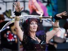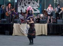 Melody Bustillos, dances with swords as Juana Ghani plays the Gallivan Street stage, at the