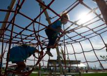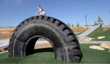 Child climbs huge tire donated from Kennicott on the amazing playground at the new Lodestone