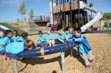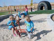 Children from Kearns Recreation Center day care program are the first to play on the amazing playground at the new Lodestone Parkat at 6200 South 6200 West on Tuesday. Salt Lake County Mayor Ben McAdams and government officials from Kearns and West Valley City dedicated the new regional park built with funds from a 2012 parks bond on the Kearns/West Valley City border. Larry H. Miller Charities donated several outdoor basketball courts to the park.