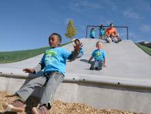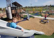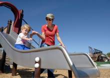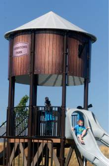 Jessica Stewart with 18-month-old son Jaimie try out one of many slides on the amazing playground at the new Lodestone Park at 6200 S. 6200 W. Tuesday September 20. Salt Lake County Mayor Ben McAdams and government officials from Kearns and West Valley City dedicated the new regional park built with funds from a 2012 parks bond on the Kearns/West Valley City border. Larry H. Miller Charities donated several outdoor basketball courts to the park.