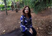 Utah artist Angela Johnson poses near "This Is My Beloved Son Joseph Smith" - History 1:17, Thursday, September 22, 2016 in the The Light of the World garden, Thursday, September 22, 2016.