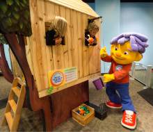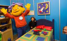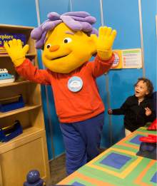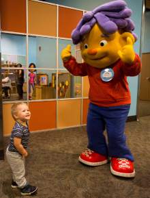 Collin Maloney, 1, Bountiful, meets Sid the Science Kid at the Discovery Gateway's newest tra