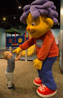 Collin Maloney, 1, Bountiful, meets Sid the Science Kid at the Discovery Gateway's newest traveling exhibit which brings the award-winning PBS Kids TV series Sid the Science Kid to life. Friday, September 23, 2016. The public opening is Saturday at 11:00 am.