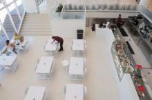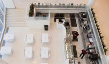 Typically, walls that are at least 7 feet 2 inches high will suffice. But in the case of the cubicle-size dispensing area at Encore Bistro which has four high walls and an open ceiling the mixing could still be visible from above.