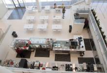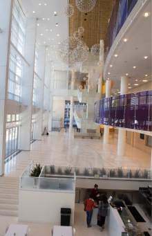 Crews are scrambling to construct the "Zion Ceiling" and make it aesthetically appealing in the expansive six-story open lobby in time for the theater's grand opening Oct. 21.