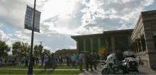 Cottonwood Heights Police officer Jeff Potter leads the color guard prior to the ceremony. Cottonwood Heights City Hall officials, dignitaries and residents celebrated its official opening with an open house and ribbon cutting September 29, 2016.