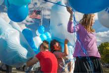 l-r Cottonwood Heights youth city council members Alissa Boyack, Nicole Cunningham and Lareesa Sumsion wrangle balloons for the ceremony in the high wind. Cottonwood Heights City Hall officials, dignitaries and residents celebrated its official opening with an open house and ribbon cutting September, 29, 2016.