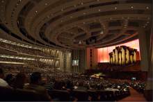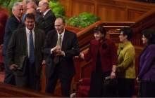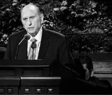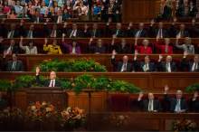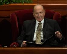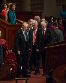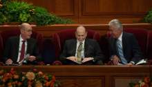 Monson and his two counselors, who make up the faith's governing First Presidency, took their places behind the pulpit, but on the opposite side of where they usually sit.