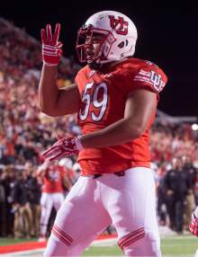 Utah defensive tackle Pasoni Tasini (59) celebrates with his team mates after he sacked Wildcats quarterback Brandon Dawkins (13) in the end zone for a safety, in PAC-12 football action, Utah vs. The Arizona Wildcats, at Rice-Eccles Stadium, Saturday, October 8, 2016.