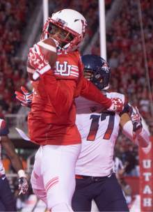 Utah Utes wide receiver Tyrone Smith (21) holds on the to ball after making a one-handed catch for a Utah touchdown, as Arizona cornerback Jace Whittaker (17) defends, in PAC-12 football action, Utah vs. The Arizona Wildcats, at Rice-Eccles Stadium, Saturday, October 8, 2016.