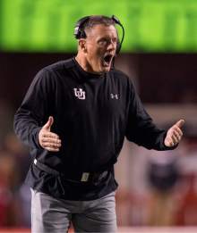 Utah Utes head coach Kyle Whittingham reacts to a call by the official, in PAC-12 football action, Utah vs. The Arizona Wildcats, at Rice-Eccles Stadium, Saturday, October 8, 2016.