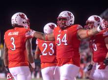 Utah Utes offensive lineman Isaac Asiata (54) celebrates after Utah quarterback Troy Williams (3) scored touchdown for the Utes, in PAC-12 football action, Utah vs. The Arizona Wildcats, at Rice-Eccles Stadium, Saturday, October 8, 2016.