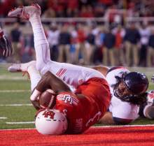 Utah quarterback Troy Williams (3) tumbles into the end zone for a touchdown for the Utes, in