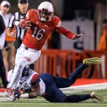 Utah wide receiver Cory Butler-Byrd (16) gets past the Arizona defender, as he runs for the U