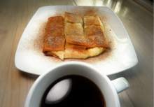 The dish is rich and filling from the house-made myzithra cheese (similar to a ricotta) that's wrapped in phyllo dough and baked until crispy, then covered in cinnamon sugar. Coffee is recommended, and sharing around the table is encouraged.