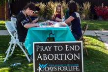 They set up tables on public property the grassy area between the street and the sidewalk flew helium balloons and had a plateful of cookies. The most provocative statements were emblazoned on a couple of T-shirts proclaiming, "I speak for those who can't" and "I vote pro-life."